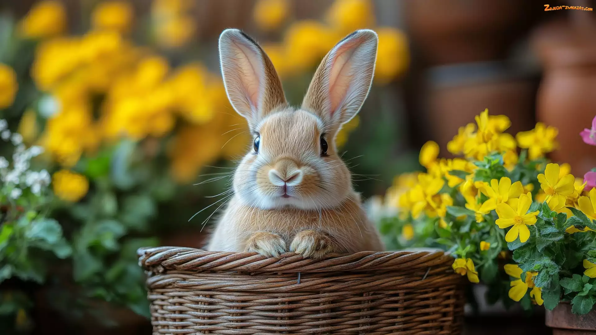 Zdjęcie: Królik, Koszyk, Kwiaty, Żółte