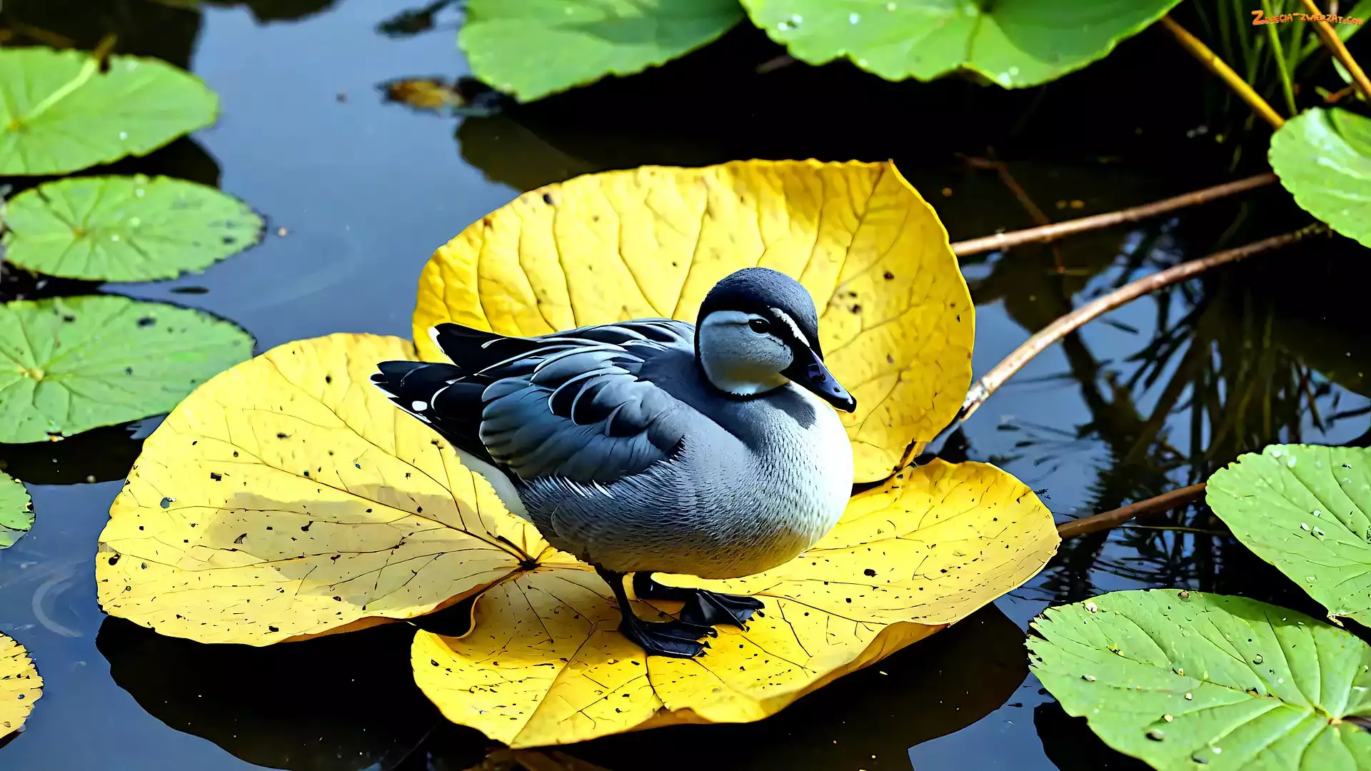 Zdjęcie: Kaczka, Staw, Liść, Żółty
