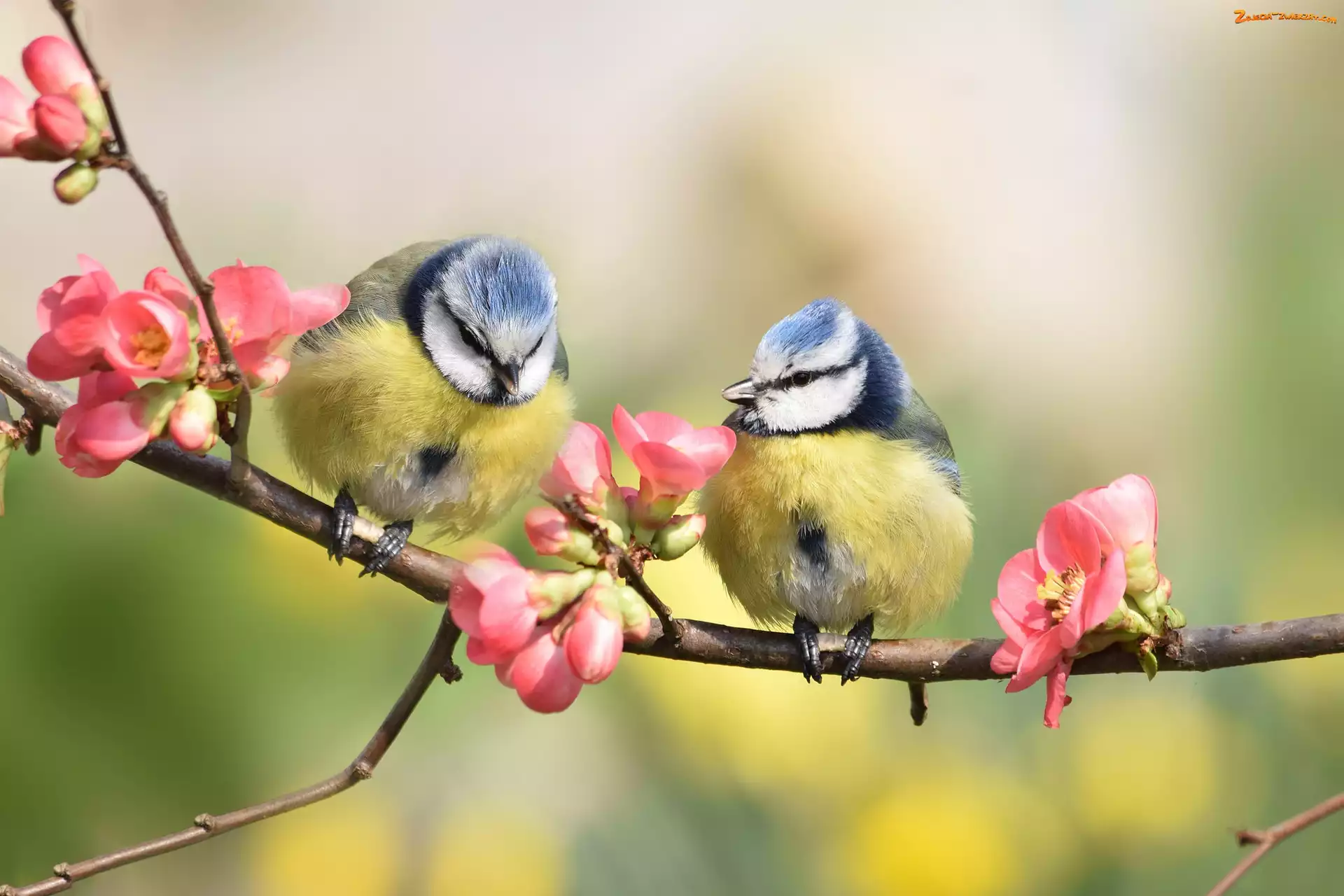 Zdjęcie: Modraszki zwyczajne, Kwiaty, Gałązka, Ptaki, Sikorki, Różowe, Dwa